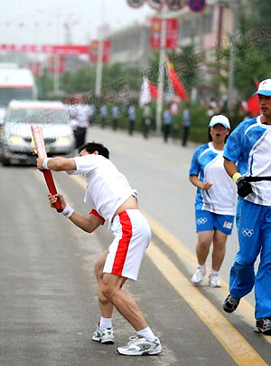 Flame still alight, Wei Wei grounds safely stunning spectators at the Olympic torch relay in Yan'an, Shaanxi Province, July 2, 2008. [www.beijing2008.cn]
