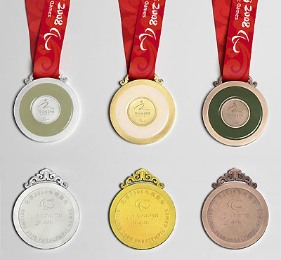 Beijing Paralympic Games gold, silver and bronze medals is seen in an official handout photo July 3, 2008. The Beijing organisers took possession of the 6,000 medals for the Olympics and Paralympics in a ceremony near Tiananmen Square on Thursday, 36 days before the start of the Games. [Agencies]