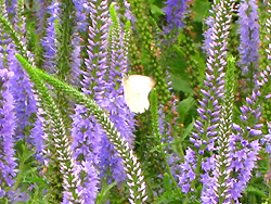 A butterfly perches on a lingleaf speedwell flower. Originating from China, the lingleaf speedwell is commonly found in blue or pink. It sells for 3.5 yuan per pot and is a perennial. [Yang Jie/Chinadaily.com.cn]