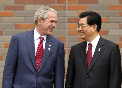 US President George W. Bush (L) laughs with Chinese President Hu Jintao during a photo opportunity at the major economies' leaders meeting at the G8 Summit in Toyako July 9, 2008. [Agencies]