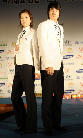 Models wear uniforms of the Korean Delegation to the Beijing Olympic Games, July 9, 2008. [Xinhua]