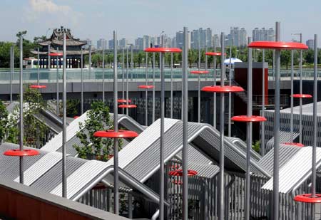 Photo taken on July 6, 2008 shows courtyard houses "knitted" with pipes at the man-made sinkage square in the Olympic Forest Park in Beijing, capital of China. [Xinhua]