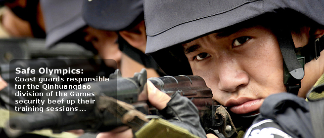 Officers and soldiers who are part of the Qinhuangdao division of the Beijing Olympic Games security take part in a training session to improve their ability to deal with emergencies, July 13, 2008. [Xinhua]