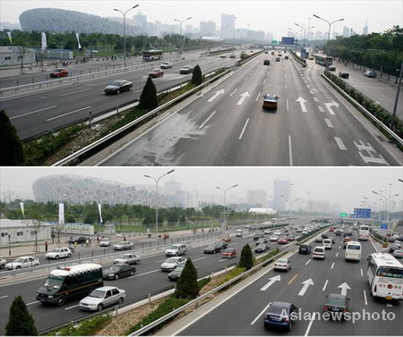 A combo pictures shows vehicles travel on the Beijing North 4th Ring Road during rush hour on July 18, 2008 (bottom) and July 20, 2008. Traffic restrictions came into affect in Beijing on Sunday in an attempt to improve the capital's air quality and traffic situation for next month's Olympics. [Asianewsphoto]
