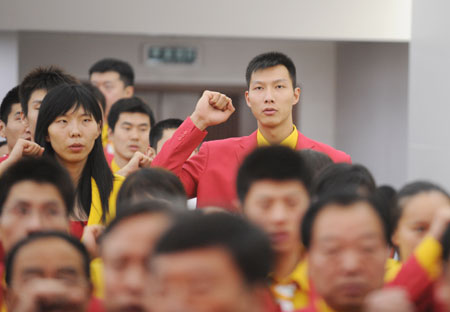 Yi Jianlian (R, back), China's national men's basketball team forward, and other top athletes and sports officials pledge to 'play with honour' at the ceremony on the formation of the Chinese delegation to the Beijing Olympic Games in Beijing July 25, 2008. The 1,099-member delegation includes 639 athletes for the Games, which is to open on August 8. [Xinhua]
