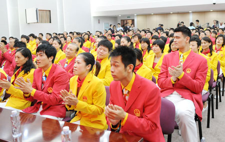 Yao Ming (R), China's national men's basketball team center, and other top athletes and sports officials pledge to 'play with honour' at the ceremony on the formation of the Chinese delegation to the Beijing Olympic Games in Beijing July 25, 2008. The 1,099-member delegation includes 639 athletes for the Games, which is to open on August  8. [Xinhua]