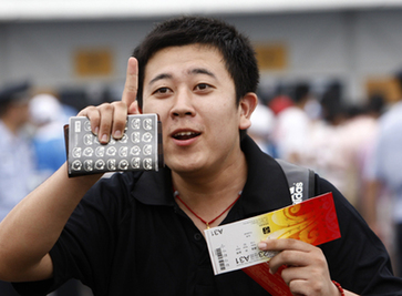A man gestures after purchasing tickets for next month's Olympic Games as they went on sale on Friday at a ticket booth in Beijing July 25, 2008. Thousands of people began queuing on Wednesday, in a last-ditch attempt to secure a ticket for the Olympics. [Agencies]