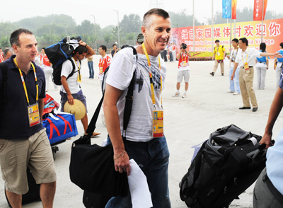 Two foreign reporters from the Olympic News Service (ONS) arrive at the Green Homeland Media Village in Beijing, July 25, 2008. [Xinhua]