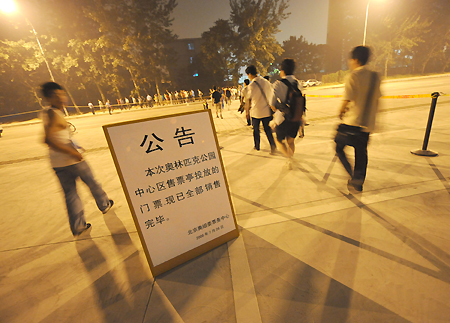 A notice board stands near an Olympic ticket office in Beijing to inform people that all the tickets have been sold out, July 26, 2008. Tickets for events held in venues in and around the Olympic Green have been sold out in the morning, on July 26, 2008. [Xinhua]