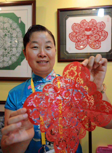 Folk artist Sun Erlin displays a piece of her paper-cutting in the shape of the Chinese character "fu", which means "happiness".The 47-year-old Sun from Inner Mongolia Autonomous Region will display her paper-cuttings at the Olympic Village during the Games. [Xinhua]