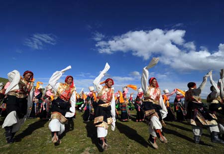 Tibetan herdsmen perform the Guozhuang dance, a folk dance popular among the Tibetan ethnic group, to celebrate the forthcoming Beijing 2008 Olympic Games on the Nagqu Grassland in Nagqu, southwest China's Tibet Autonomous Region, Aug 4, 2008. [Xinhua]