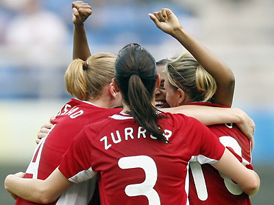 Canada's Candace Champan (back) raises her arms as she celebrates scoring against Argentina with team mates Martina Franko (R), Emily Surrer (3) and Clare Rustad during their Group E women's soccer match at the Beijing 2008 Olympic Games in Tianjin, August 6, 2008. Canada beat Argentina 2-1. [Agencies]
