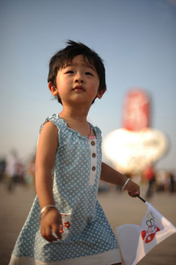 A little girl holds a 2008 Beijing Olympic games' flag on Tiananmen square in Beijing on August 5th, 2008. [Agencies]