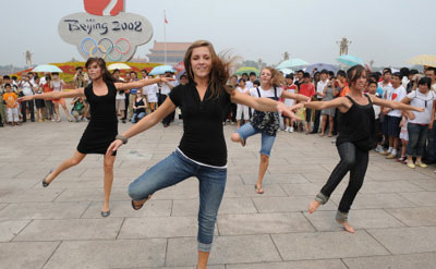 Members of the Christian Dove Dance group from Oklahoma in the US hold an impromptu dance on Tiananmen Square in Beijing on August 7, 2008. [Agencies]