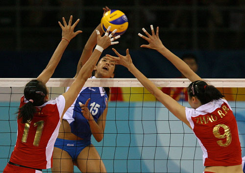 Genesia Franchesco Machado (Background) of Venezuela vies for the ball with China's Li Juan (L) and Zhao Ruirui during a 2008 Beijing Olympic Games Preliminary Pool A match in the Womens Olympic Volleyball on August 9, 2008 at the Beijing Institute of Technology Gymnasium. China won the game 3-0. [Agencies]