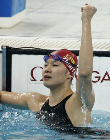 Zhou Yafei of China celebrates after winning her women's 100m butterfly heat at the National Aquatics Center during the Beijing 2008 Olympic Games, August 9, 2008. [Agencies]