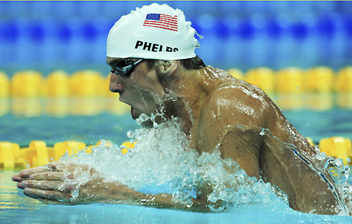 Michael Phelps of the US competes in the heats of the men's 400m individual medley swimming competition at the National Aquatics Center during the Beijing 2008 Olympic Games August 9, 2008. Phelps won the gold in the final. [Agencies]
