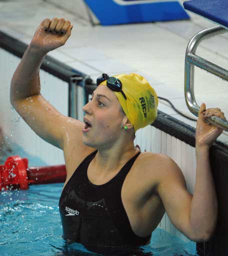 Australia's Stephanie Rice celebrates after winning the women's 400m individual medley swimming final at the National Aquatics Center in the 2008 Beijing Olympic Games on August 10, 2008 in Beijing. Stephanie Rice of Australia broke the world record in the women's 400 metres individual medley in a time of four minutes 29.45 seconds at the Beijing Olympics on Sunday. [Agencies]