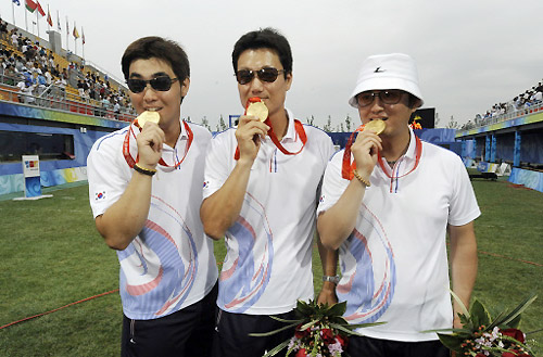 South Korean archers (L-R) Im Dong-Hyun, Park Kyung-Mo and Lee Chang-Hwan pose with their gold medals after winning the men's team archery competition of the Beijing Olympic Games on August 11, 2008. [Agencies]