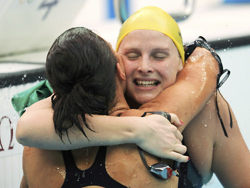 Gold medallist Leisel Jones of Australia (R) hugs bronze medallist Mirna Jukic of Austria after winning the women's 100 meters breaststroke final at the National Aquatics Center during the Beijing 2008 Olympic Games August 12, 2008. [Agencies]