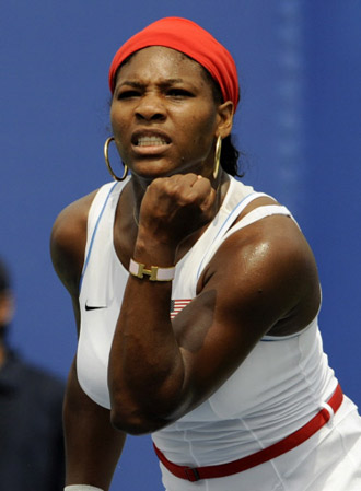 Serena Williams from the USA reacts after winning a point against Samantha Stosur from Australia during a women's singles tennis match at the 2008 Beijing Olympic Games on August 12, 2008 in Beijing.[Agencies]