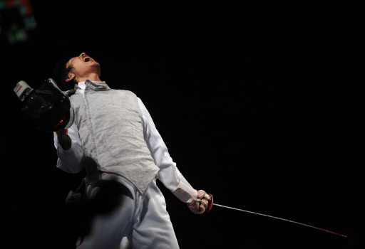 China's Lei Sheng celebrates after defeating Poland's Slawomir Mocek (unseen) in the men's individual Foil round of 16 match on August 13, 2008 at the Fencing Hall of National Convention center, as part of the 2008 Beijing Olympic games.[Agencies]