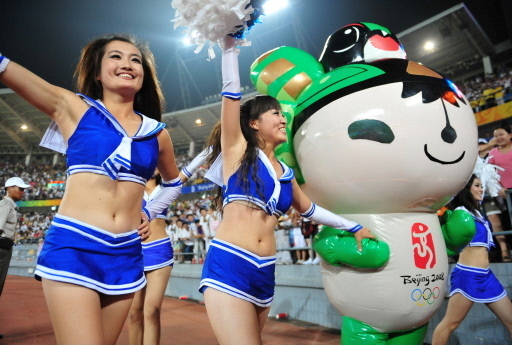 Chinese cheerleaders and an inflatable Beijing Olympics Fuwa mascot dance around the stadium during halftime entertainment in the women's first round group E football match between Sweden and Canada at the Beijing 2008 Olympic Gmes on August 12, 2008.[Agencies]