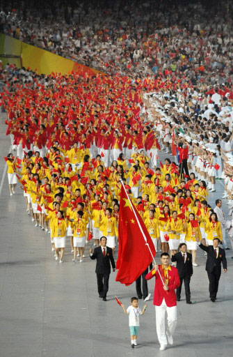 General view shows Chinese flag bearer Yao Ming (R) leads the Chinese delegation next to nine-year-old Lin Hao during the opening ceremony of the 2008 Beijing Olympic Games in Beijing on August 8, 2008.The three-hour show at Beijing's iconic "Bird's Nest" National Stadium is set to see more than 15,000 performers showcase the nation's ancient history and its development. [Agencies]