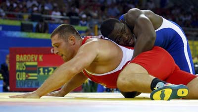 Khasan Baroev of Russia (in red) fights Mijain Lopez of Cuba during their 120kg men's Greco-Roman wrestling final bout at the Beijing 2008 Olympic Games August 14, 2008. [Agencies]