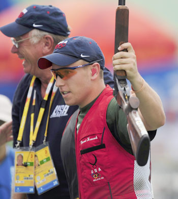 Vincent Hancock of the US celebrates his victory next to a team mate during the men's skeet shooting final at the Beijing 2008 Olympic Games August 16, 2008. [Agencies]