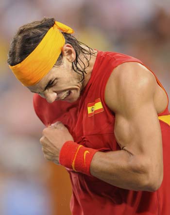 Rafael Nadal of Spain reacts during his men's singles final tennis match against Fernando Gonzales of Chile at the Beijing 2008 Olympic Games August 17, 2008. [Agencies]