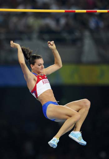 Yelena Isinbayeva of Russia competes during her women's pole vault of the athletics competition in the National Stadium at the Beijing 2008 Olympic Games August 18, 2008. [Agencies]