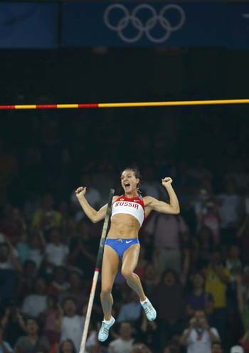 Yelena Isinbayeva of Russia breaks the world record during the women's pole vault final of the athletics competition in the National Stadium at the Beijing 2008 Olympic Games August 18, 2008. Isinbayeva cleared 5.05 metres, beating the previous mark of 5.04 metres she had set last month, after taking gold in the event. [Agencies]