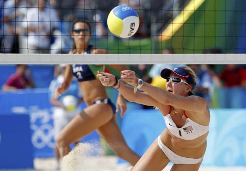 Kerri Walsh of the US sets the ball during their women's beach volleyball semifinal match against Brazil at the Beijing 2008 Olympic Games, August 19, 2008.Misty May-Treanor and Kerri Walsh of the US will meet Chinese duo Tian Jia and Wang Jie in the final. [Agencies]