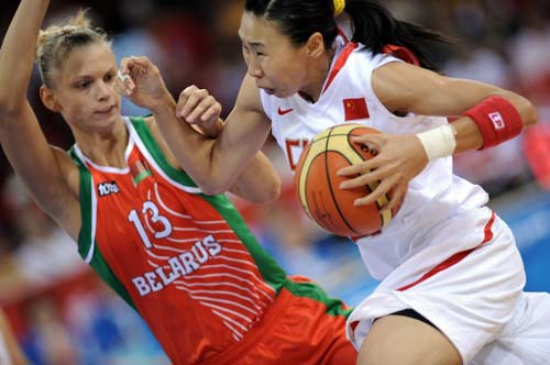 China‘ Miao Lijie (R) dribbles past Belarus' Tatyana Troina during their women's quarter-final basketball match China vs. Belarus at the Olympic basketball gymnasium on August 19, 2008 in Beijing, as part of the 2008 Beijing Olympic Games. [Agencies]