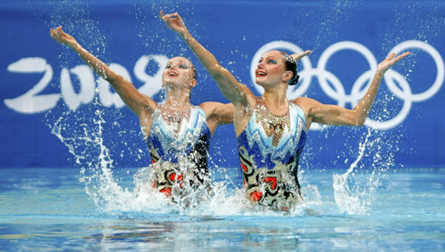Anastasia Davydova and Anastasia Ermakova of Russia perform in the synchronised swimming duet free routine preliminary round at the Beijing 2008 Olympic Games August 19, 2008. [Agencies]