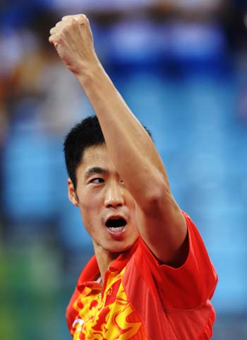 Wang Liqin of China celebrates after winning his men's singles bronze medal table tennis match against Jorgen Persson of Sweden at the Beijing 2008 Olympic Games August 23, 2008.[ Agencies]