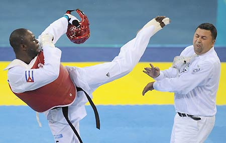 Angel Valodia Matos (L-red) of Cuba lands a kick on the face of referee Chakir Chelbat (R) of Sweden after he lost his bronze medal contest in the men's +80 kg taekwondo competition against Arman Chilmanov of Kazakhstan during the 2008 Beijing Olympic Games in Beijing on August 23, 2008. Cuba's former Olympic taekwondo champion Angel Valodia Matos was expelled from major international competitions for kicking the referee in the head when he was disqualified in the match. [Agencies]