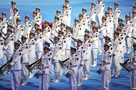 Band perform at the closing ceremoy of 2008 Beijing Olympic Games at the National Stadium also know as the "Bird's Nest" on August 24, 2008. [Xinhua]