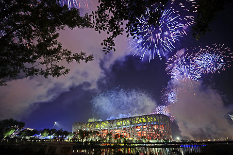 Fireworks light up the sky over the National Stadium, also known as the Bird's nest, at the start of the closing ceremony of the 2008 Beijing Olympic Games in Beijing on August 24, 2008.[Agencies]
