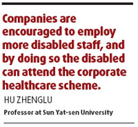 "Companies are encouraged to employ more disabled staff, and by doing so the disabled can attend the corporate healthcare scheme," Hu said, adding that for those severely disabled, funds for their healthcare are also available.
