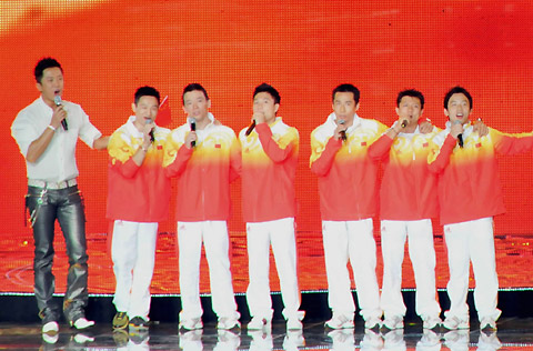 China's men's gymnastics team gold medalists perform with Mao Ning, September 1, 2008. [Xinhua]