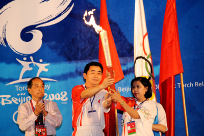 Taekwondo player Hieu Ngan Tran, Vienam's first Olympic silver medalist in Sydney 2000, was among the 60 torchbearers who carried the flame across town from the Ho Chi Minh City Theater past other landmarks.