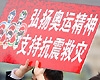 Local residents hold up a banner that reads, "Spread the Olympic Spirit and Support Earthquake-relief Efforts" while watching the Beijing Olympic torch relay in Jinggangshan, East China's Jiangxi Province, May 15, 2008. [Xinhua]