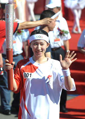 As the first torchbearer Liu Yan, a figure skater and Qiqihar native, carries the torch during the Beijing Olympic torch relay in her hometown of Heilongjiang Province, July 13, 2008. [Xinhua]