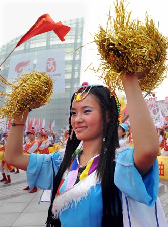 A performer cheers torchbearers during the Zhengzhou leg of the Beijing Olympic torch relay in Zhengzhou, capital city of China's most populous Henan Province, July 25, 2008. [Xinhua]