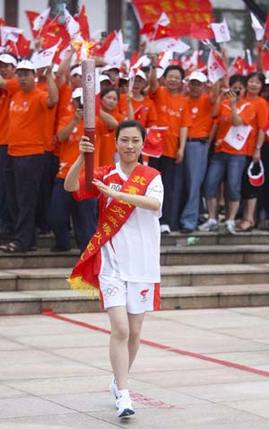 First torchbearer Jiang Min, a national model for her devotion to the quake-relief work, runs with the torch during the Beijing 2008 Olympic Games torch relay in Guang'an City, southwest China's Sichuan Province, August 3, 2008. [Xinhua]