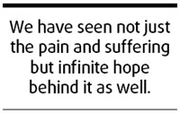 Updated: 2008-05-21 07:18 My daughter belongs to the younger generation known as the "post-1980 kids". A journalist, she went to the earthquake-hit areas in Sichuan a few days ago. I will never forget the moment just before she boarded her flight at the airport. She never experienced a natural calamity of such magnitude in her young life until now or faced so stern a test of her mettle, which is why she could not help feeling somewhat nervous. As her parents we were worried just as naturally and, unlike when she went on previous reporting trips elsewhere, I saw her off at the airport this time. It was time for boarding. She held my hands in hers and stared at me with teary eyes as if making sure her father's image was securely stored in her heart.