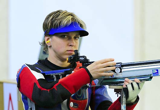 Beijing Paralympics 1st gold medalist Veronika Vadovicova of Slovak competes in the women's 10-meter air rifle standing SH1 final in Beijing, September 7, 2008. [Xinhua]