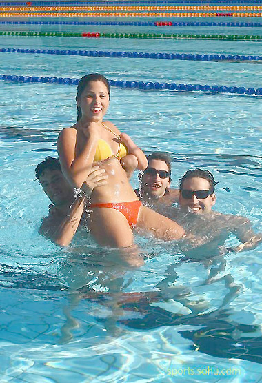 Four Paralympic athletes from Argentina play with water at the Paralympic Village in Beijing, September 12, 2008. [sohu.com